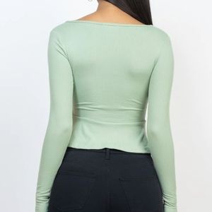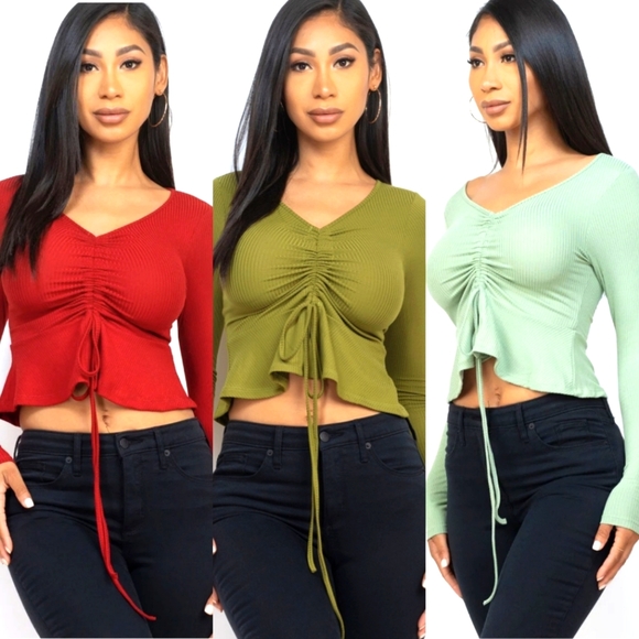 Ribbed drawstring front long sleeve peplum top. Various colors & sizes!
