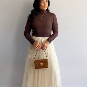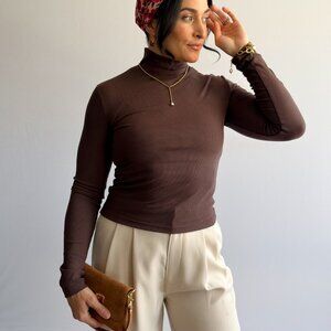 Your layer-for-everything essential, now in a rich cocoa brown. This ribbed mock-neck top delivers a smooth, body-skimming fit with comfy stretch, giving you the polish of a turtleneck without the bulk. Lightweight and breathable, it slips under blazers, cardigans, trench coats, and dresses, and pairs effortlessly with denim, wide-leg trousers, minis, and boots. An elevated basic you’ll reach for on repeat—from work to weekend and travel. Why You'll Love It: Elevated basic Brown 91% rayon, 9% spandex Rib knit Stretch Fitted Long sleeve Mock neck Opaque Size & Fit: The Women’s Ribbed Mock Neck Long-Sleeve Top fits true to size. It's a stretch-to-fit style top and is very soft. This top feels very high quality and fits like a dream. We recommend ordering your usual size. The model is wearing size medium. Model Info: 5'5 145lbs Chest: 35" Waist: 28" Hips: 38" Size: M, 6/8, 27