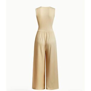 This womens ribbed tank jumpsuit is in brand new condition, never worn. Features a flattering ruched V-neckline, sleeveless cut, and a comfortable wide-leg fit. Perfect for summer outings, vacations, or casual parties. Made from soft, lightweight ribbed fabric for an elegant yet relaxed look.