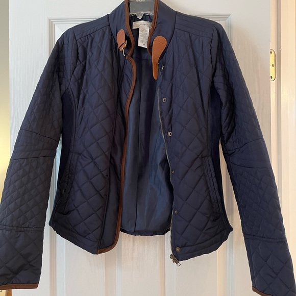Women’s navy riding jacket. (Juniors sz M) fits like a women’s small. Beautiful jacket in excellent condition with button cuff details and buckle at collar.