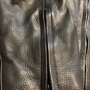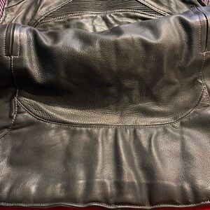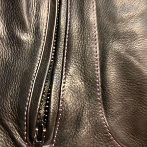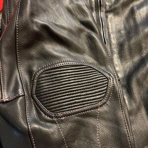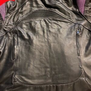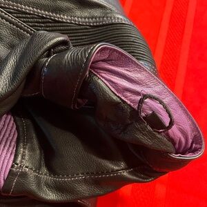 Vintage Xelement Women’s Black & Purple Padded Riding Jacket with removable inside insert. Padded shoulders with Purple ribbed padding, padded elbows, and multiple pockets included air pockets and headphone pockets.