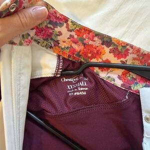 Sleek burgundy athletic top with a front zip placket. White contrast panels at the neckline. Floral inner collar and cuff detail. Sporty and stylish for workouts or casual wear.