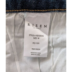 This is a pre-owned - EUC Risen Jeans denim skirt, size M. It features a blue wash with distressed detailing on the front and back pockets. The skirt has a frayed hem and a standard five-pocket design. The material composition is 95% cotton, 3.5% polyester, and 1.5% spandex (It's stretchy)