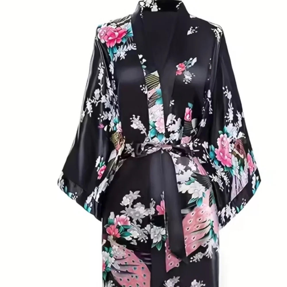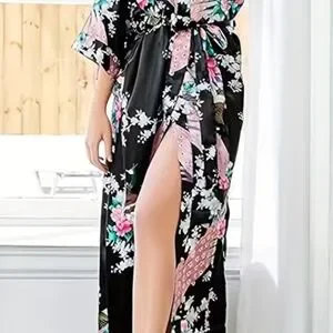 Elegant floral kimono style women's robe, soft skin friendly, v-neck with belt, all season comfortable casual set