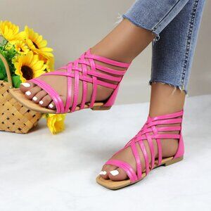 Women's Roman Gladiator Muliti Straped Back Zip Design Flat Heel Sandals Pink