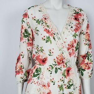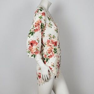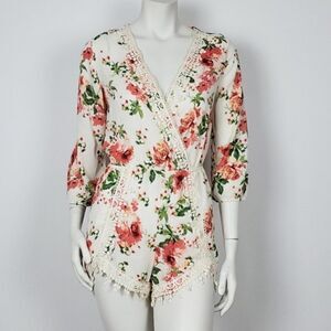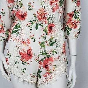 Lovely Floral Romper with Crochet Detail. This Color can be Describe as Beige. True to Color.