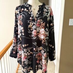 New plus size women's blouse in size 3x. Has ruffle detailing around neckline with v-neck. Sleeves can be kept long or can be rolled up w/button closure for 3/4 length comfort. Material is 97% polyester, 3% elastane. Lightweight and soft.