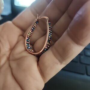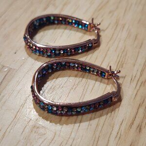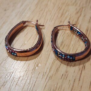 ROSE GOLD TONE INSIDE OUT OVAL HOOP EARRINGS WITH SPARKLING MULTICOLOR CRYSTALS. THEY HANG DOWN ABOUT 1 1/4". IN EXCELLENT PRE-OWNED CONDITION.
