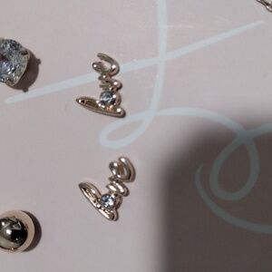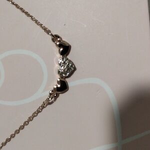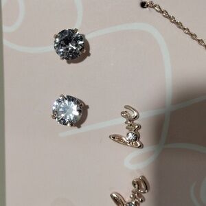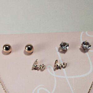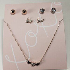 Elevate your style with this exquisite rose gold-tone necklace featuring three heart-shaped rhinestone pendants in a captivating lilac hue. The set includes three stud earrings—a classic ball, a sparkling crystal, and a love symbol—adding versatility to your accessory collection. The necklace is 16 inches with a 3-inch extender for a customizable fit. New with tag.