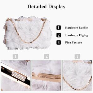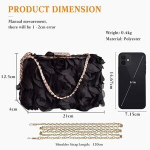 Features: Beautiful handmade satin clutch with 3D rosette flower design on both sides, giving it a romantic, luxurious vibe. Includes a rhinestone handle and a long detachable chain for versatile wear as a clutch, shoulder, or crossbody bag. Plenty of space for your essentials—keys, lipstick, cards, and more.