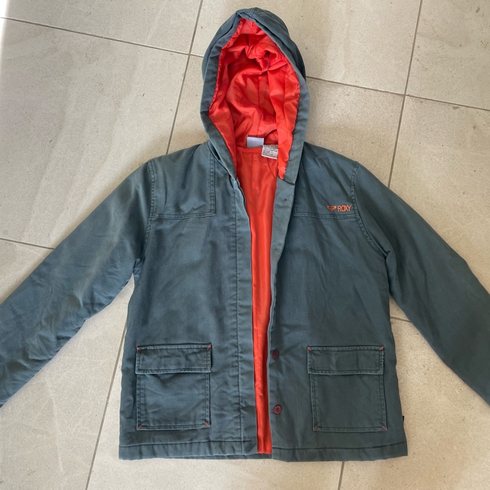 Womens Green Roxy Utility style jacket, size medium. Has a fun orange inner lining and is thicker for warmth. Fits more like a small. No rips, tears or stains and comes from a smoke free home.