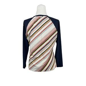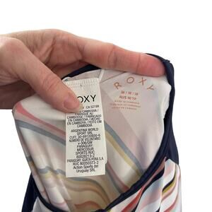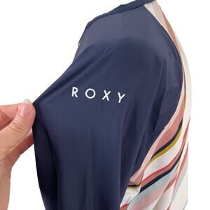 Women's Roxy long sleeved colorful striped rash guard. Logo on sleeve. Crewneck. Stretchy. white, navy, light pink, light blue, mauve, orange, green stripes. Like New