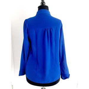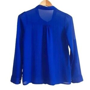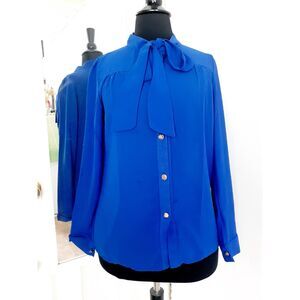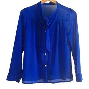 Womens Royal Blue Semi- Sheer Chiffon Tie Neck Casual Workwear LS Button Top S-M