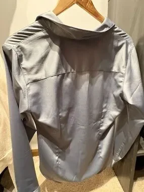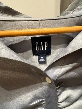 Soft button-front shirt with ruched center for a fitted look. Classic collar and long sleeves. Smooth fabric with subtle sheen.