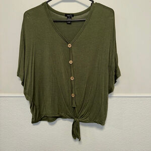 "This pre-owned Rue21 women's short-sleeve top in olive green features a V-neckline and a relaxed fit with dolman sleeves. It has five decorative light brown buttons down the front placket, leading to a tie-front hem. The fabric is a blend of 50% cotton, 48% polyester, and 2% spandex, offering a soft, lightweight feel. The size tag indicates \"M\". No significant imperfections are visible, consistent with a pre-owned item."
