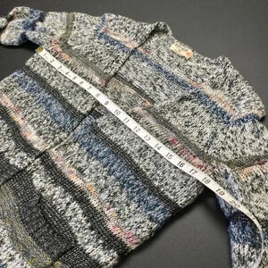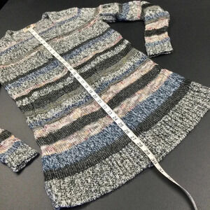 Pre-owned Ruff Hewn PM cardigan, made in China. Features a multicolored striped pattern in shades of gray, blue, and white. The material is a knit blend. Measurements: Length 30", Sleeve 25", Chest 18”. Open front design. No closures. Overall excellent condition.