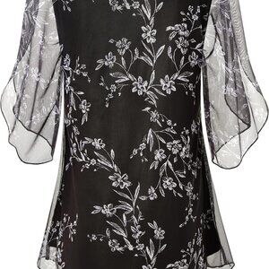 Features: Light, flowy floral mesh layer with added stretch and wrinkle resistance, plus a unique double cross 3/4 ruffle sleeve with flowing, delicate mesh fabric. Easy to match with jeans, skirts, or pants for any occasion, from casual outings to dressier events.