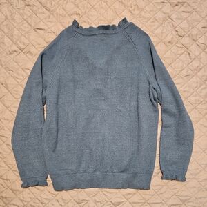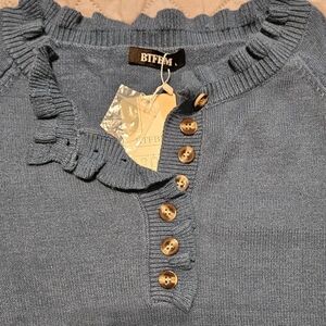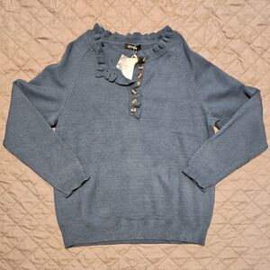 Description: Elegant blue sweater featuring stylish ruffle details and button accents. From Amazon. Fits slightly small.
