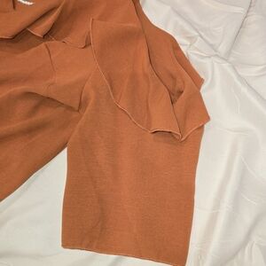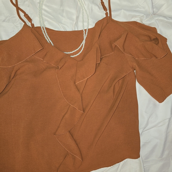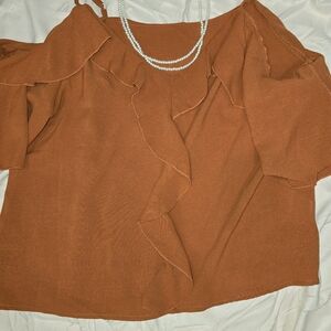 Elevate your style with this chic rust-colored ruffled off-shoulder top. Perfect for any occasion, this top offers a blend of elegance and comfort.