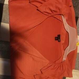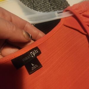 Elevate your style with this elegant rust-colored wrap top featuring ruffled sleeves. Perfect for any occasion. This East 5th women's orange blouse in size large is a stylish and versatile piece for any wardrobe. With a V-neckline and 3/4 cap sleeves, this blouse offers a comfortable and flattering fit. Made from a blend of polyester and spandex, it is machine washable for easy care. The pullover closure and solid pattern make it perfect for various occasions, from casual to business. The ruffle accents add a touch of flair to this basic yet chic blouse, making it a must-have for the summer, fall, or spring seasons.