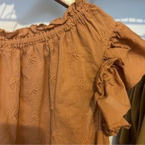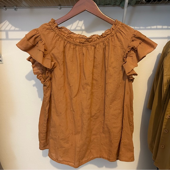 Elevate your style with this chic tan top featuring elegant ruffles. Perfect for any occasion.