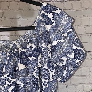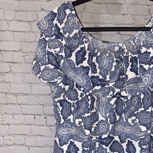 Women’s Ruffled Tunic Top Good Condition!! 97% Polyester 2% Spandex Blue and White Paisley Print Size: 1X We love to do bundles!!