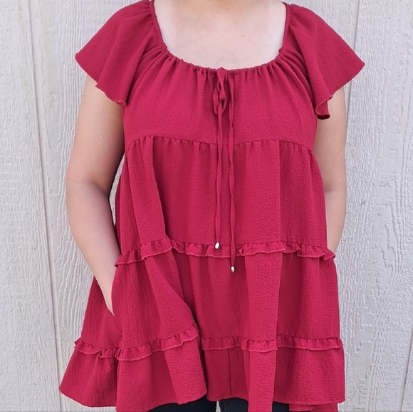 Chic and stylish red ruffle top for women. Perfect for square dancing. Add a black jean with a black belt and black boots for a more grunge look. Has pockets. The tag is worn but the top itself is in like new condition.