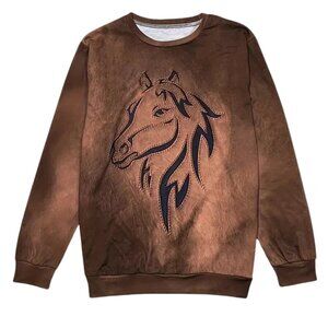 Western, Boho, Equestrian, Casual, Cozy, Comfortable, AnimalPrint, HorsePrint, GraphicSweater, LongSleeve, Pullover, FallFashion, WinterFashion, Rustic, Chic, Unique, StatementPiece, EverydayWear, WeekendWear, Loungewear, DistressedLook, VintageInspired, EarthTones, Brown, Tan, BlueAccent, Crewneck, RelaxedFit, Oversized, SoftFabric, Warm, Autumn, LayeringPiece, FarmhouseStyle, CountryChic, Outdoorsy, NatureInspired, HorseLover, GiftIdea, Stylish