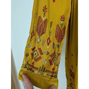 Womens S Boho Long Sleeve Dress Embroidered V Neck Gold Mustard Yellow Hippie