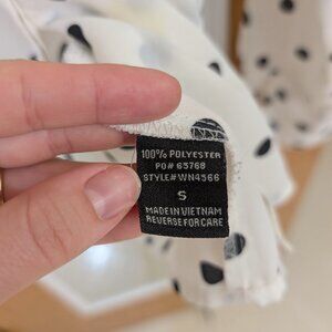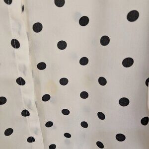 Polka dot button-down blouse from Timing (Charlotte Russe). Lightweight fabric has a chiffon-like feel. Missing one button in front, but buttons are not visible when wearing. Faint stain on front, see photos. From a dog-friendly, smoke-free home. Super cute for the office!