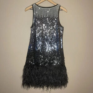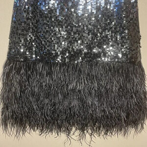 Mini. Tank. Drop waist. Sequin bodice. Feather hem. Side zipper closure. Black, sequins pick up light. Thin ostrich feathers detailing along the bottom of the dress
