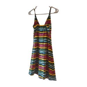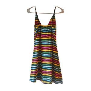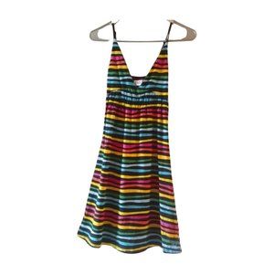 Women's O'Neill Rainbow neon yellow, pink, green, pastel blue, blue and orange horizontal striped black tank top style stretchy asymmetrical dress with a v-neckline. Embroidered blue O'Neill on the back on the top.