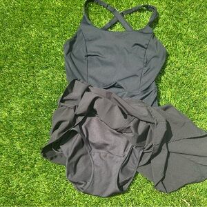 Black workout romper with cute cutout and built-in underwear! Back zipper pocket for ear buds, cards or phone…helpful for a run! Padding is not included.