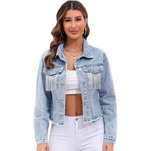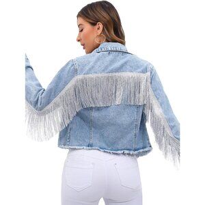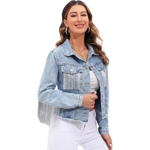Womens S177blue Fringe Denim Jacket Casual Oversized Jean Coat Long Sleeve