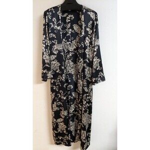The Women's SENSARA 2-Piece Nightgown & Matching Robe in size Small is a stunning floral patterned set perfect for a relaxing night's sleep or a special occasion. The sleeveless gown features a cowl neck and a decorative pink shoulder tie, while the long sleeve robe is belted for a comfortable and adjustable fit. Made from lightweight satin material in a navy blue and white color, this robe and gown set exudes a beach, wedding, love, and classic theme. The set includes pockets and is machine washable for easy care, making it a versatile and stylish addition to any woman's wardrobe.
