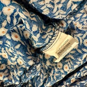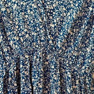 Charming blue dress with floral pattern. Features ruffle sleeves and a flowing skirt.