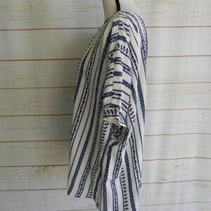 Women’s SHEIN PEASANT top Blouse Casual STRIPED TIE NECK Boho SHORT SLV TOP 2XL, GREAT USED CONDITION. GORGEOUS WHITE/NAVY BLUE FLORAL STRIPED PATTERN WITH CUTE TIE NECK WITH WOOD BEADS FOR A COMPLETE BOHO LOOK. MEASURES FROM ARMPIT TO ARMPIT:24" AND FROM TOP OF SHOULDER TO HEM:28". POLYESTER.