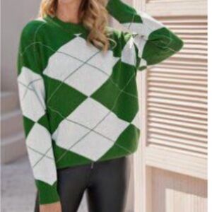 Women's SHEIN vintage vibe green Argyle Pattern pullover crewneck sweater, size S, thick viscose/acrylic/nylon material. Its preloved, used once only, looks like new. #vintagevibes #shein #sweater #crewnexk