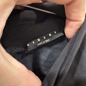 This is a women's black Sisley blouse with a turtleneck neckline and short sleeves, designed in a Y2K style. It is a size Small and falls under the Regular size type category. This versatile top can be worn for various occasions and can be easily paired with different bottoms to create stylish outfits. Perfect for adding a touch of sophistication to your wardrobe, this Sisley blouse is a timeless piece that offers both comfort and style.