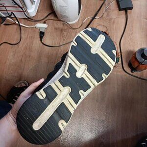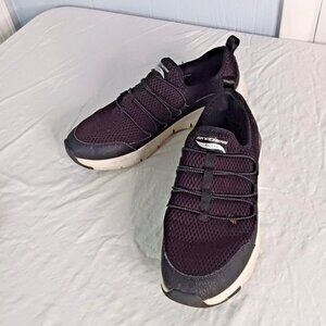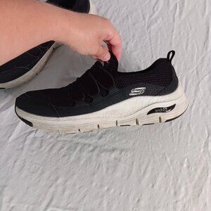 Elevate your walking experience with these stylish and comfortable Skechers Arch Fit-Lucky Thoughts walking shoes. Featuring a slip-on closure and metallic silver elastic lace accents, these shoes are perfect for activewear and casual occasions. The synthetic upper material and rubber outsole provide durability and support, while the lightweight design ensures comfort. These shoes are part of the Skechers GOwalk product line and are a great for women who enjoy walking. The black color and solid pattern provide a classic and designer look, making them suitable for any season- winter, summer, fall, or spring. Whether you are a nature lover or a fitness enthusiast, these shoes are a must-have in your collection. Size is 11 (US). I think they are in overall nice shape. One shoe has a small stain on the top which is pictured. They both have nice tread left on bottom of soles and have rich black color along with the silver thread in the elastic laces. Thanks for looking!