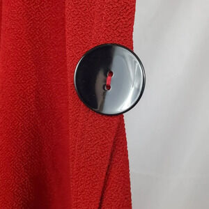 Women's Soft Surroundings Mesa Button Vest, long red draped open front vest, size L large. Vest features relaxed lapels, textured material, and 3 large chunky buttons on each side. Very boho lagenlook and a great color for the holidays or any bold feature. Measurements are approximately 32.5" in length and 23" from pit to pit. Material content is 69% acetate/29% polyester/2% spandex.