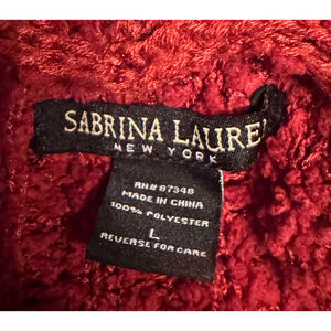 This is a pre-owned Sabrina Lauren New York women's cardigan sweater in a deep Cabernet color, size L. It features an open-front design with a textured, popcorn-knit 100% polyester fabric. The cardigan has long sleeves and two front patch pockets. The care tag indicates machine wash cold with like colors, do not bleach, lay flat to dry, do not tumble dry, low iron on reverse side if needed. No significant visible imperfections are apparent.