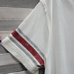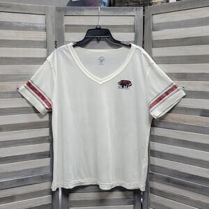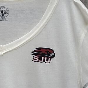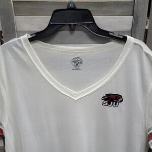 Sport your pride in style with this classic white V-neck T-shirt, tailored for comfort and versatility. The design features the bold 'SJU' logo and striking red hawk emblem on the left chest, perfect for showcasing your allegiance to St. Joseph's University or another SJU institution. Red and gray striped accents on the sleeve ends add a trendy touch, making this shirt suitable for both casual and spirited occasions. Crafted for everyday wear, this size XL tee promises breathability and softness for all-day comfort. Grab yours today and elevate your wardrobe with this must-have piece!