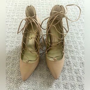Brand NIB ‘Sexy Yet Conservative’ lace up heels in nude that will elongate your legs and provide stability with their solid heel! These are a must in every wardrobe and heartbroken in having to sell them, with two hip replacements my stilettos and high heel days are dwindling.
