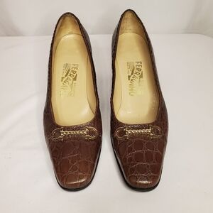Womens Salvatore Ferragamo 7B Brown Croc-Embossed Chunky 3" Heels Gold Chain