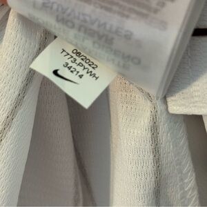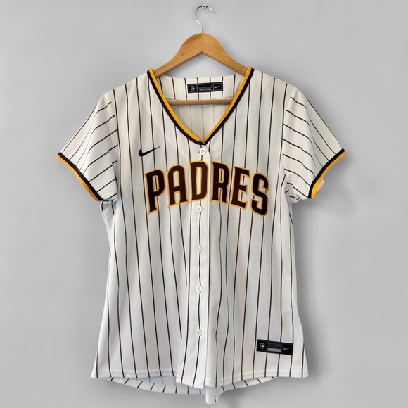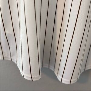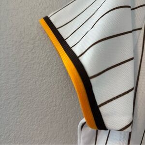 White jersey with sleek brown stripes. Bright yellow accents. Nike logo on display.