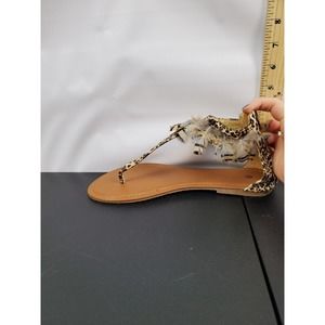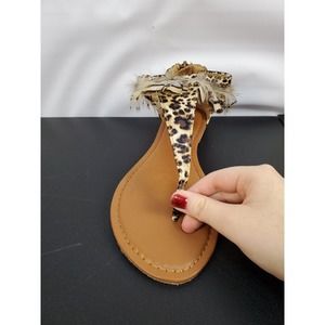 Womens Sandals Brown Feather Leopard Print Flats Heel Clip Toe Back Zipper Sz 8