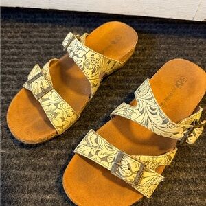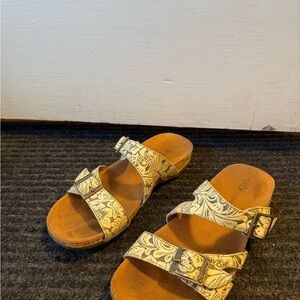 Sage green floral sandals with adjustable buckles. They don’t fit me like they used to #floral #sandals #barepaw #barepawshoes #summer