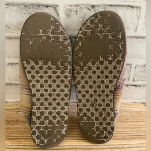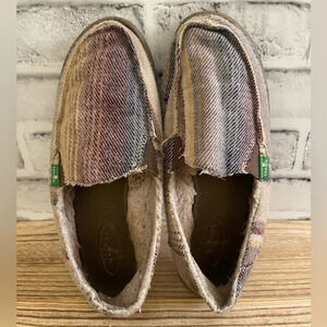 Women’s. Sanuk. Flannel style fuzzy lined slip on shoes. Stripes. Good preowned condition. Some wear on the soles. Size 6.