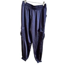 INC International Concepts satin utility cargo joggers for women. Tapered legs with cargo pockets. Deep purple color with satin like material that is so soft! In great condition. Great for a streetwear casual look, but could also be dressed up for something more edgy due to the glossy satin material. Great statement piece! Note that the color is brighter than on the model- the color really depends on the light. Size small.